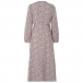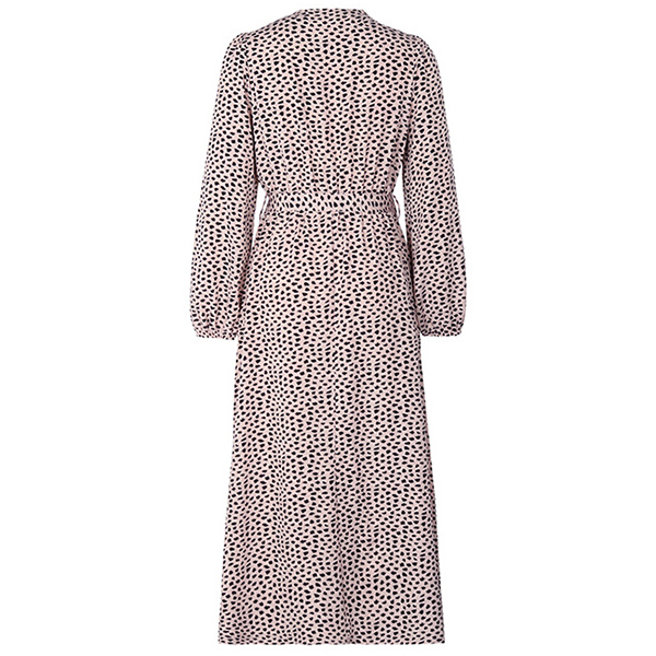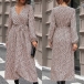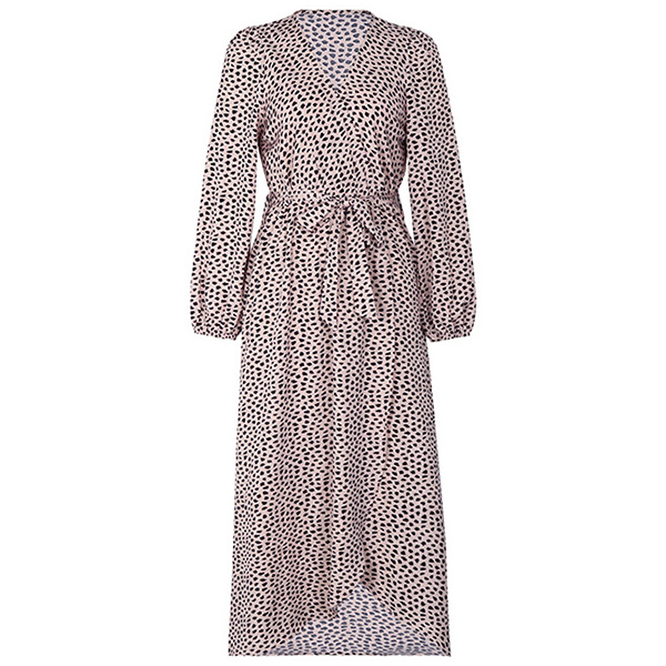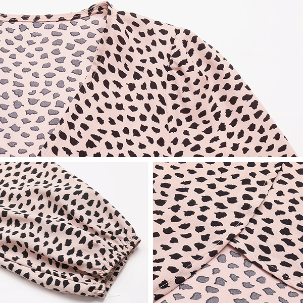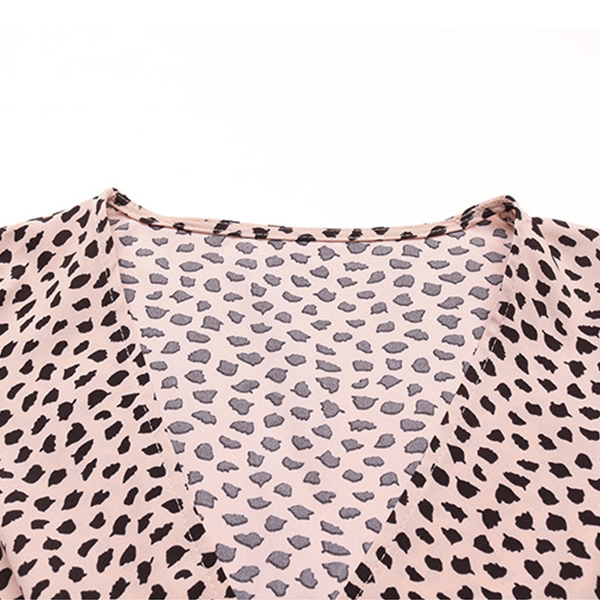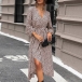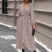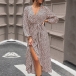 Fashion Leopard Printed V-neck Long Sleeve Self-tie Slit Midi Dress