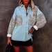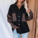 Fashion Leopard Spliced Lantern Sleeve POLO Collar Front-pocket Shirt