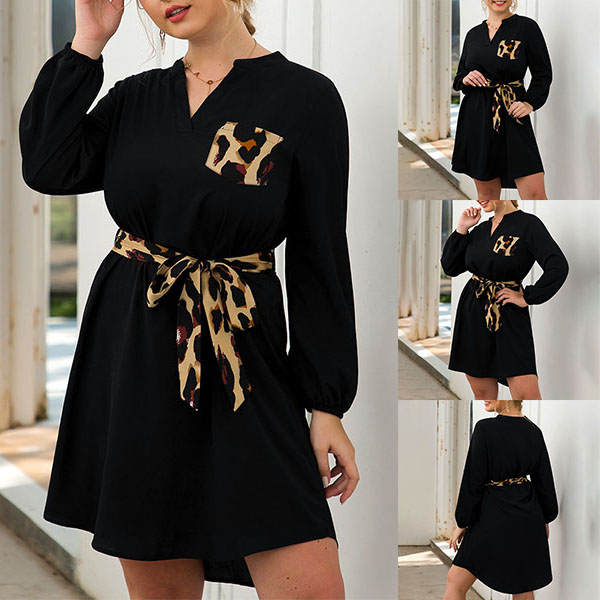 Start your wonderful day with a delightful piece such as this dress. The leopard spliced chest patch pocket and waist strap design make this piece look so stylish and attractive,while the lantern sleeve design will further enhance its charm. No matter for your busy workdays or weekend out,this versatile dress can be a wise choice.