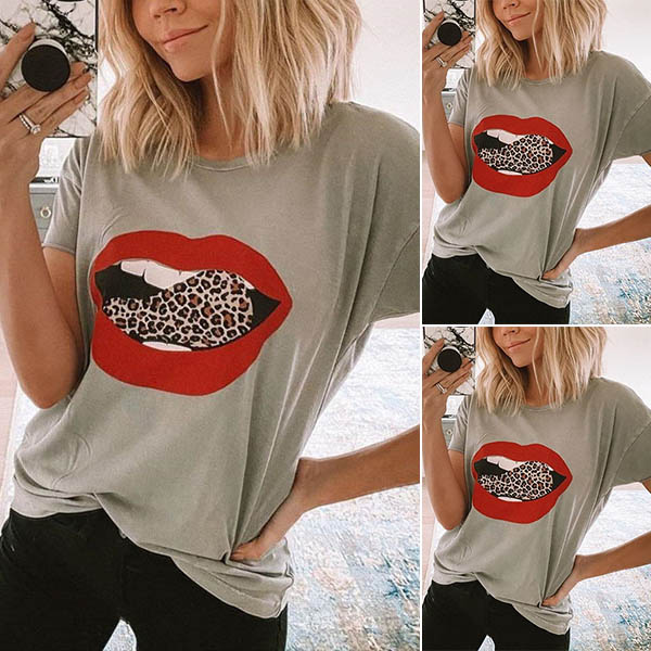 Crafted from soft and breathable fabric,with short sleeve and round neck design,this t-shirt not only can give you a comfortable day,but also can be matched with different style bottoms. What's more,the leopard spliced lip pattern design will lend you a dash of playful and chic vibes. Perfect fit for your casual days.