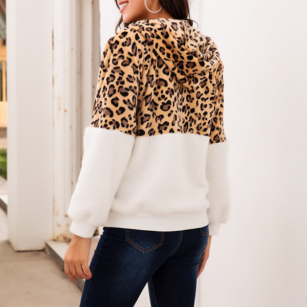 Fashion Leopard Spliced Long Sleeve Hooded Plush Coat