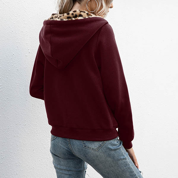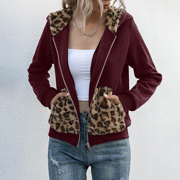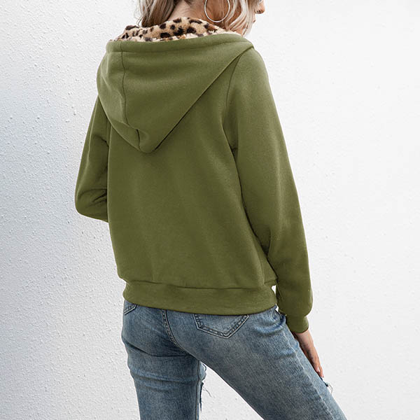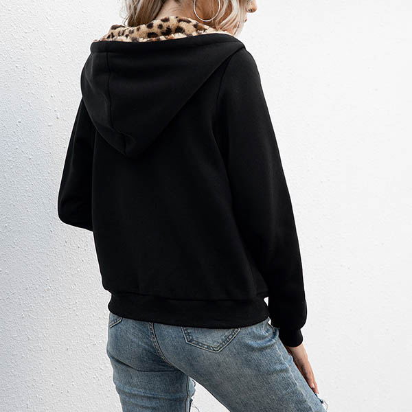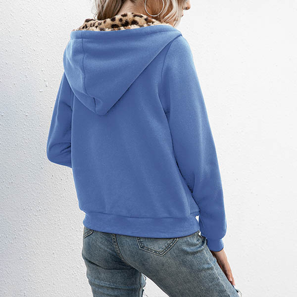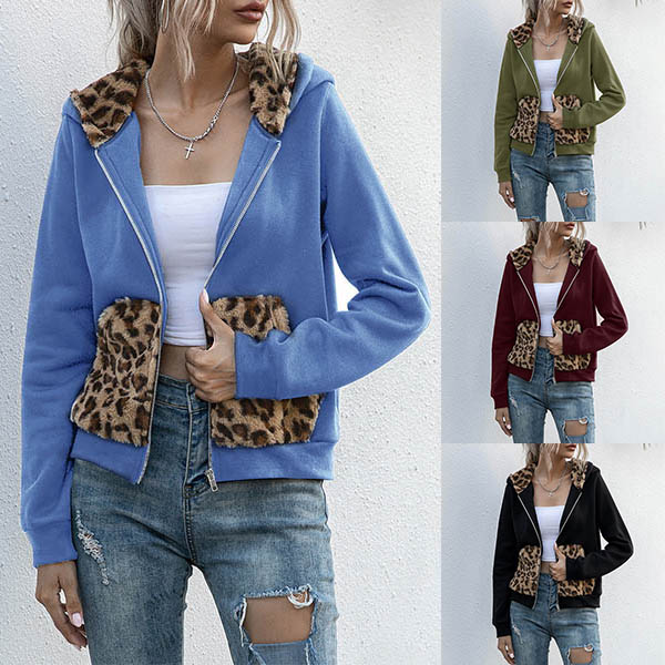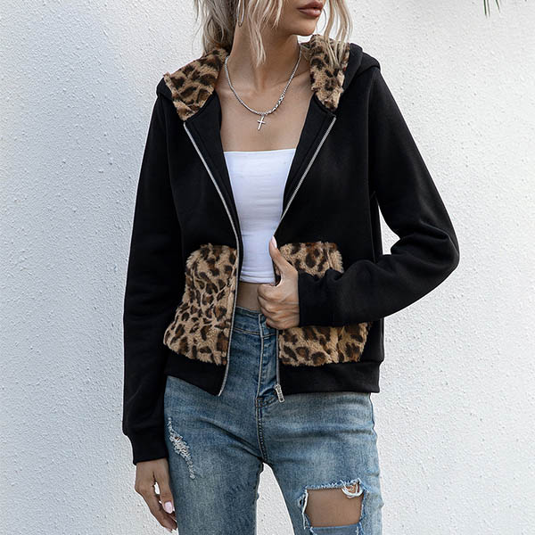 Fashion Leopard Spliced Long Sleeve Hooded Sweatshirt Coat