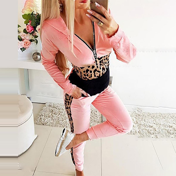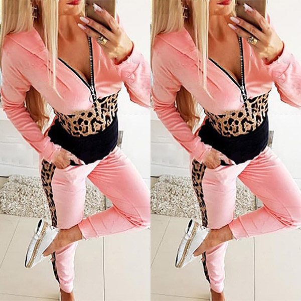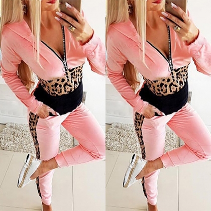 Fashion Leopard Spliced Long Sleeve Hooded Sweatshirt + Pants Two-piece Set