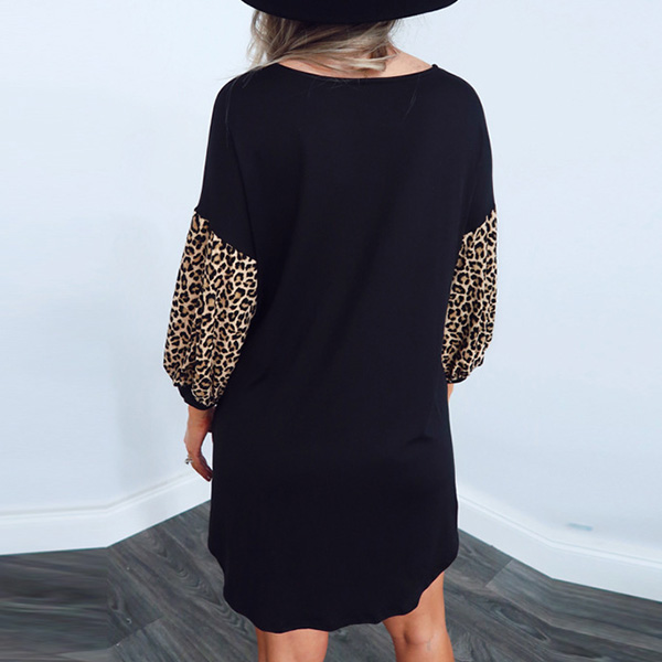 Fashion Leopard Spliced Long Sleeve Round Neck Loose Dress(It runs big)