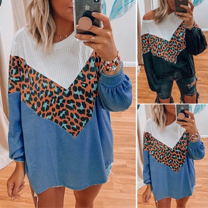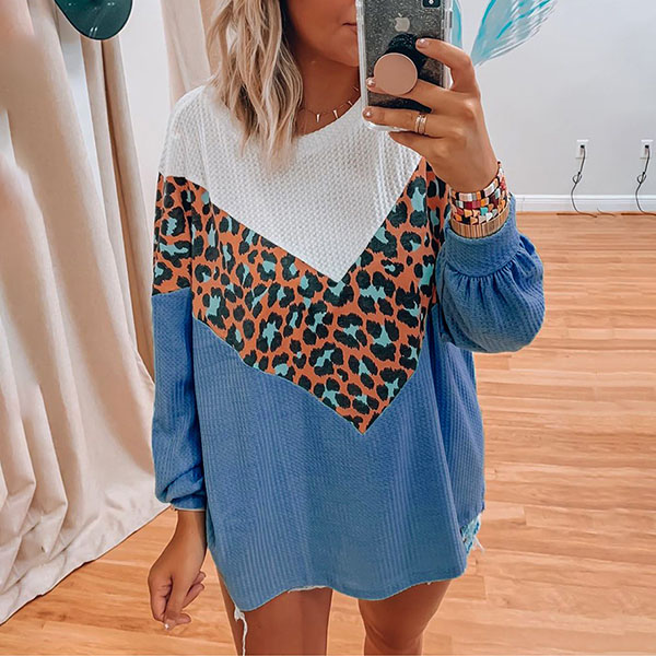 When the weather gets drop,this knit top can easily strike your mind. Contrast color element and leopard spliced details make this piece look more stylish and attractive,while its soft knitted fabric and loose silhouette design can give you a comfortable day. It is perfect fit for your spring and autumn days.
