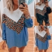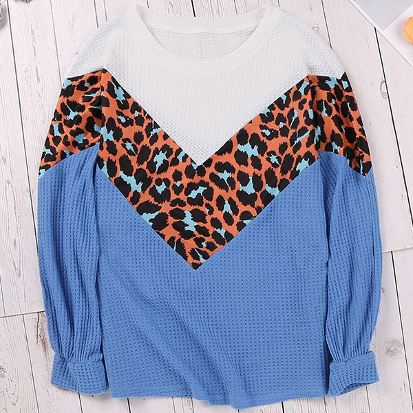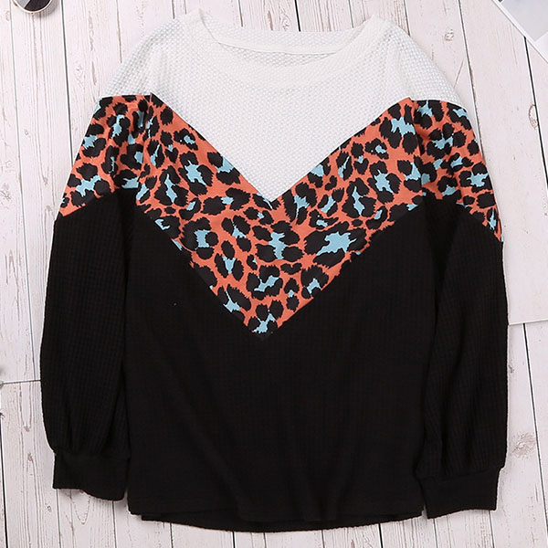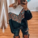 Fashion Leopard Spliced Long Sleeve Round Neck Contrast Color Knit Top