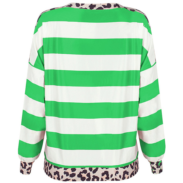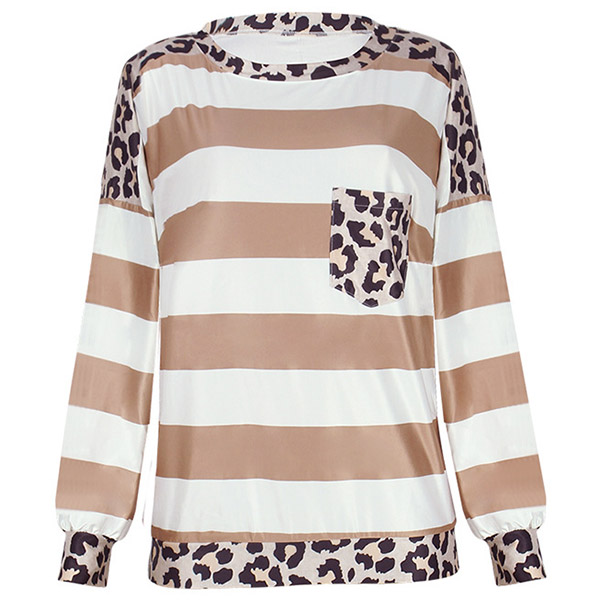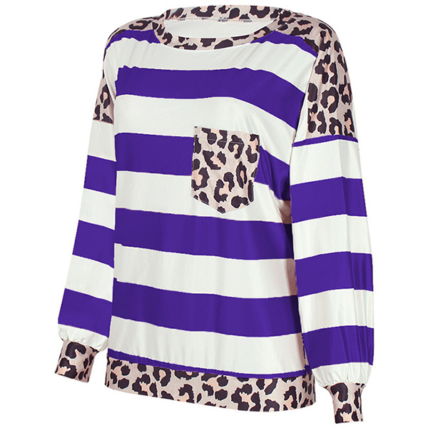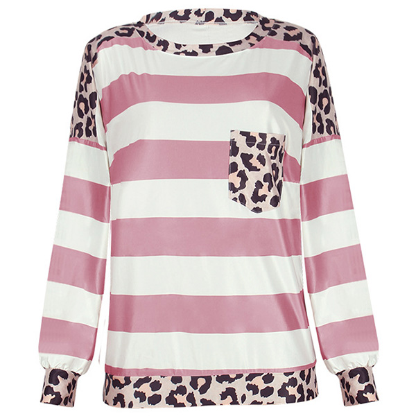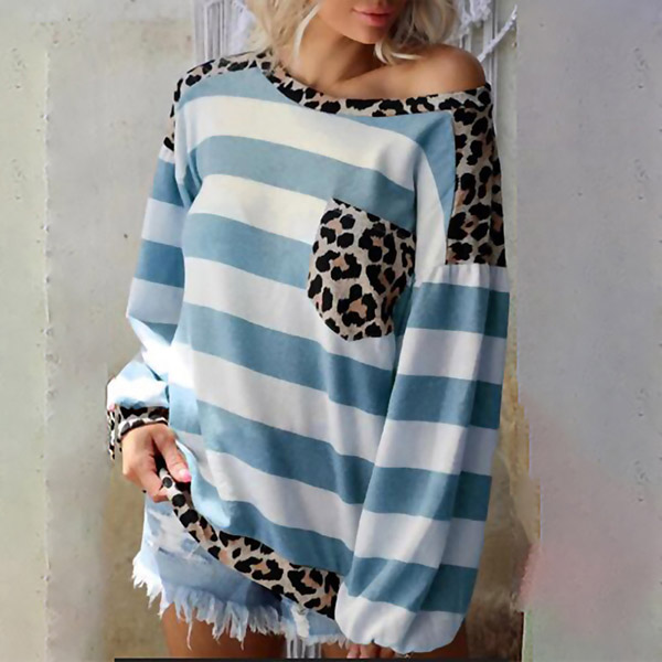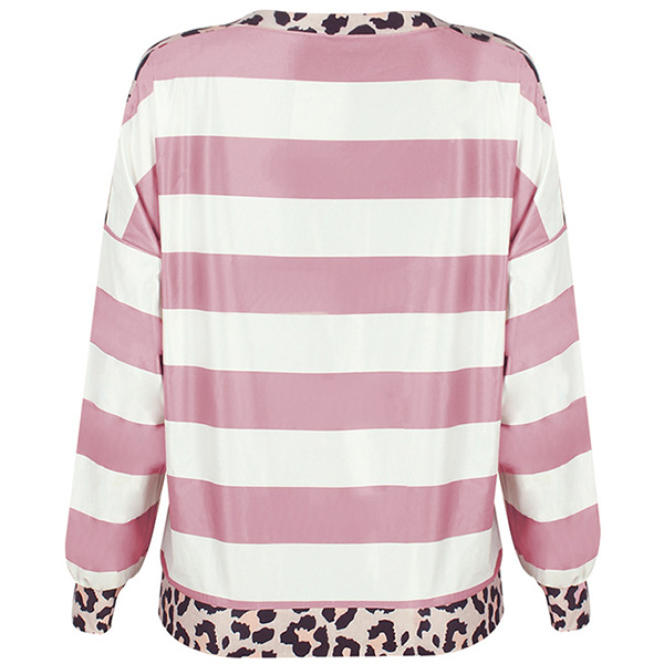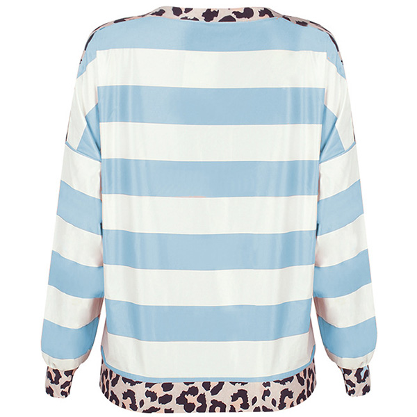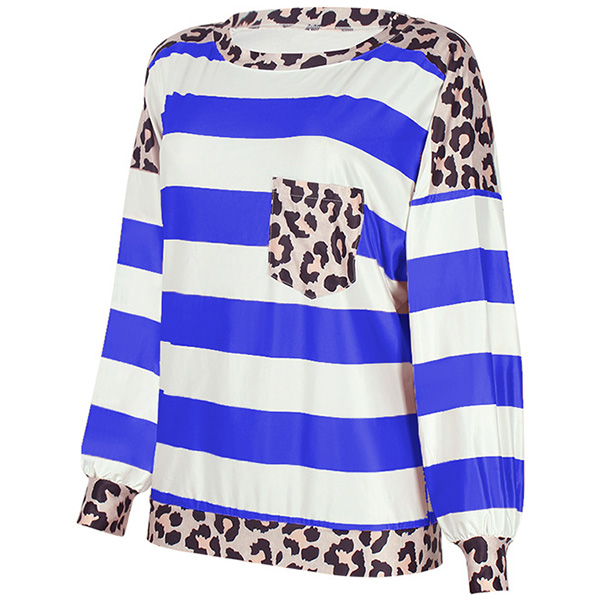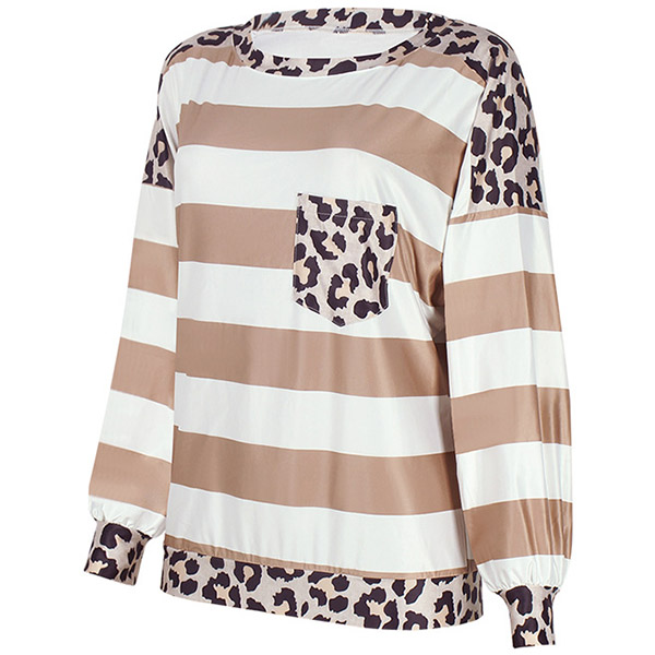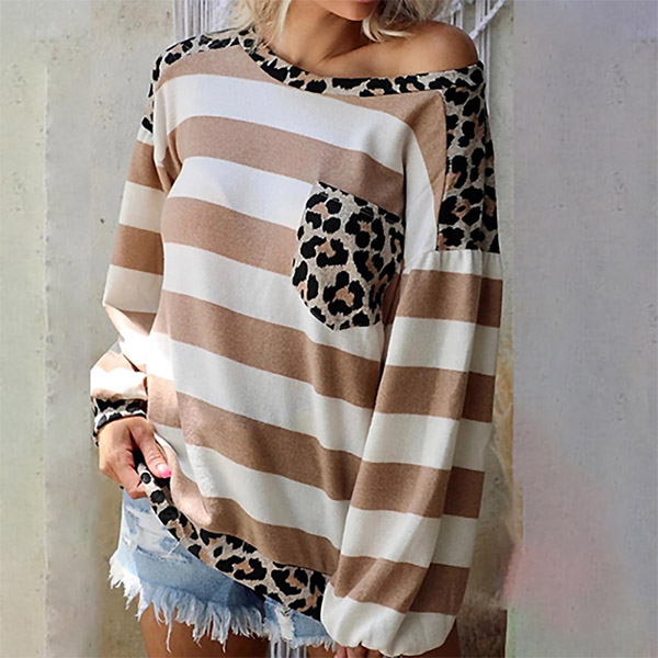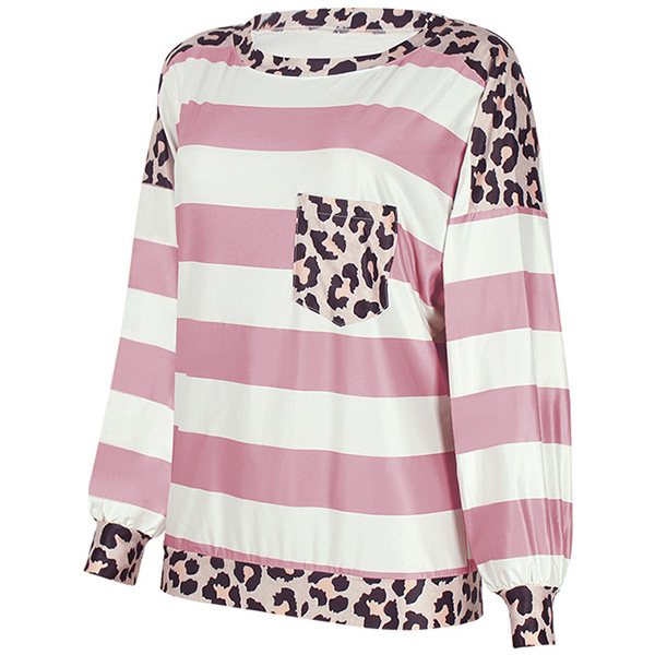 Fashion Leopard Spliced Long Sleeve Round Neck Loose Stripe T-shirt