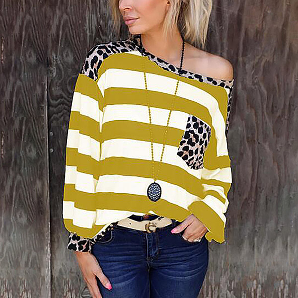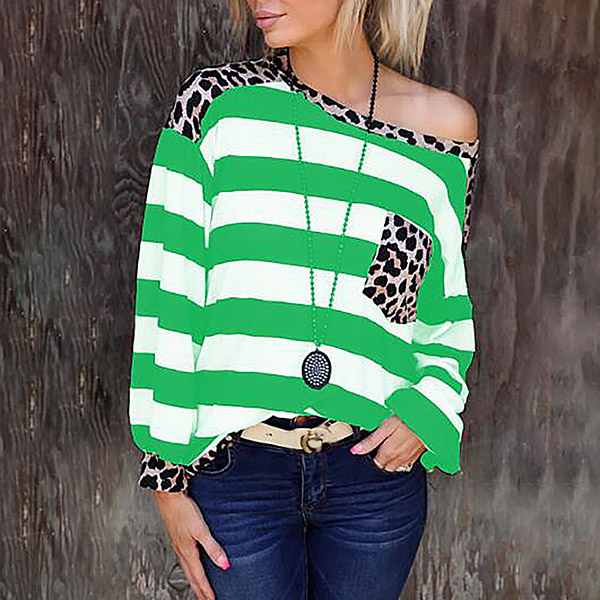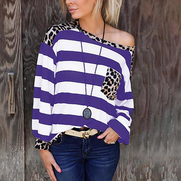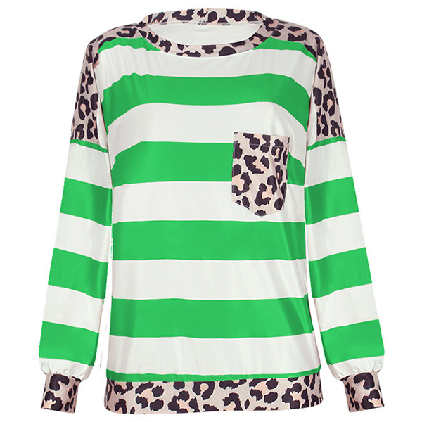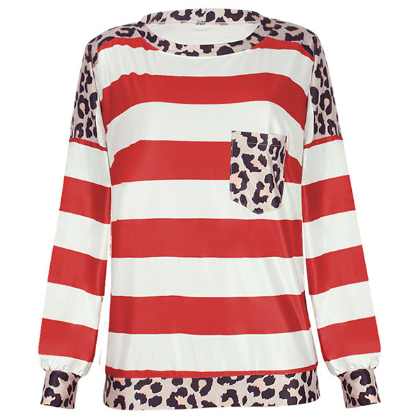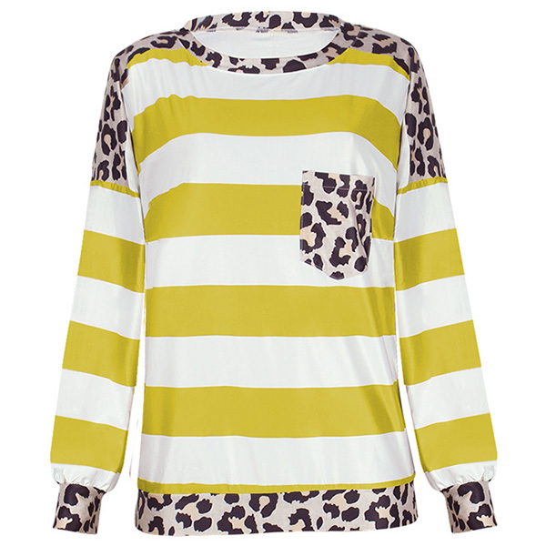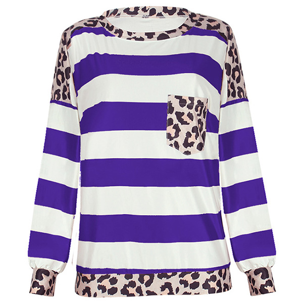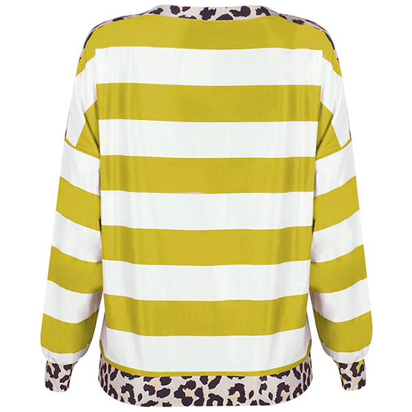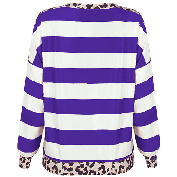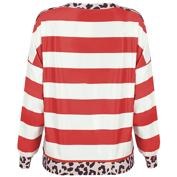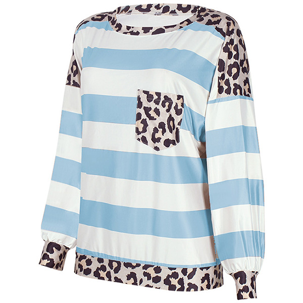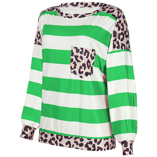 Fashion Leopard Spliced Long Sleeve Round Neck Loose Stripe T-shirt