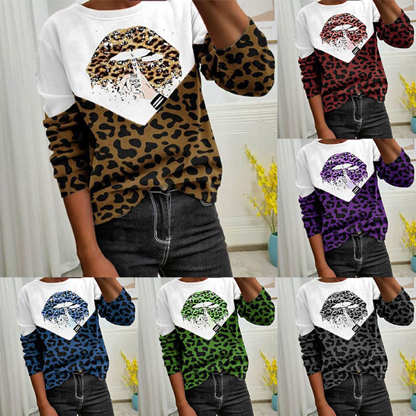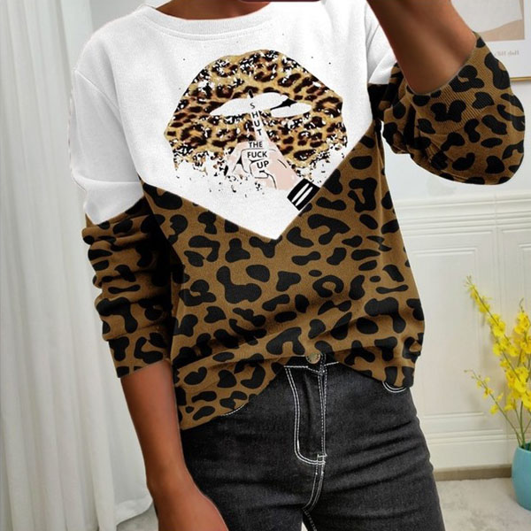 Fashion Leopard Spliced Long Sleeve Round Neck Sweatshirt