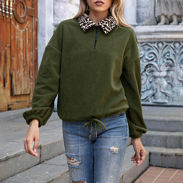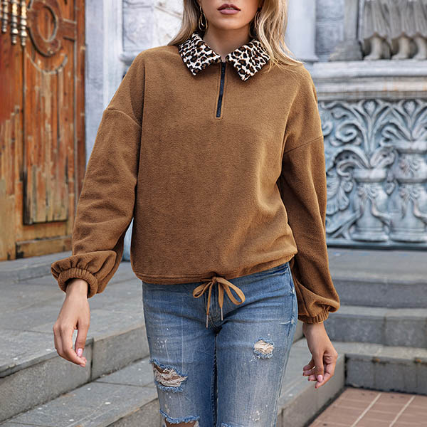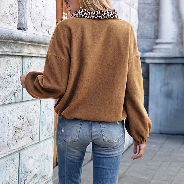 Fashion Leopard Spliced Long Sleeve Stand Collar Plush Sweatshirt