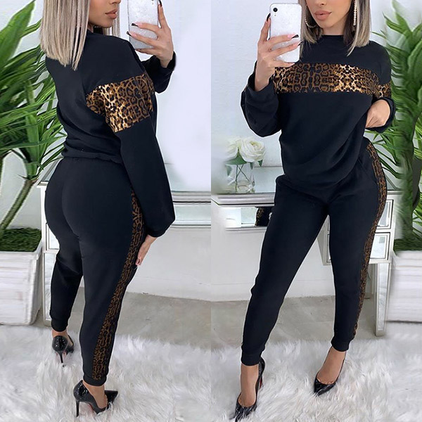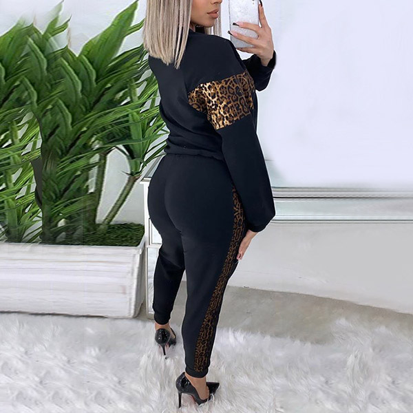 Fashion Leopard Spliced Long Sleeve Sweatshirt + Pants Two-piece Set