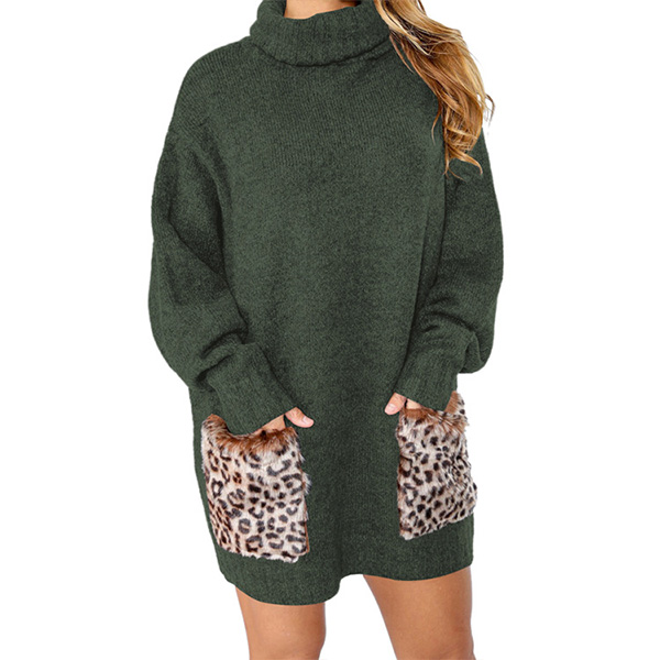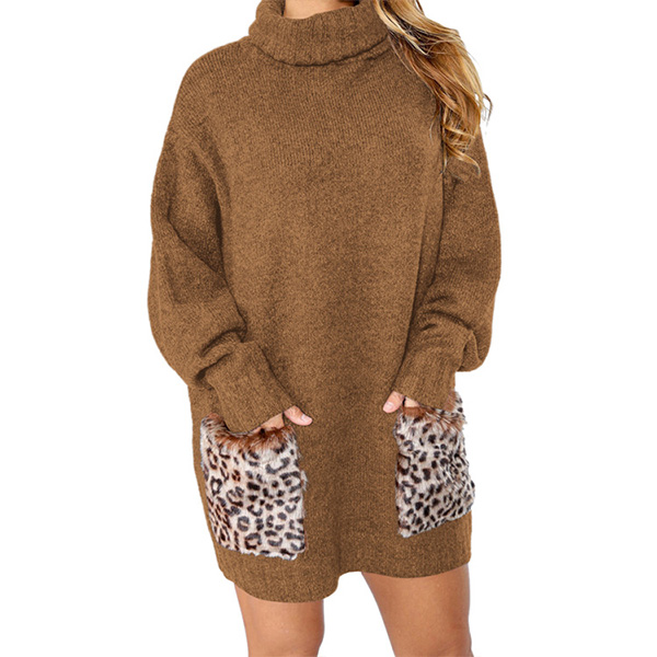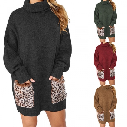 Fashion Leopard Spliced Pocket Long Sleeve Turtleneck Sweater