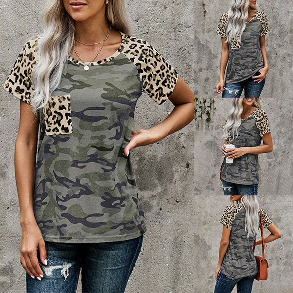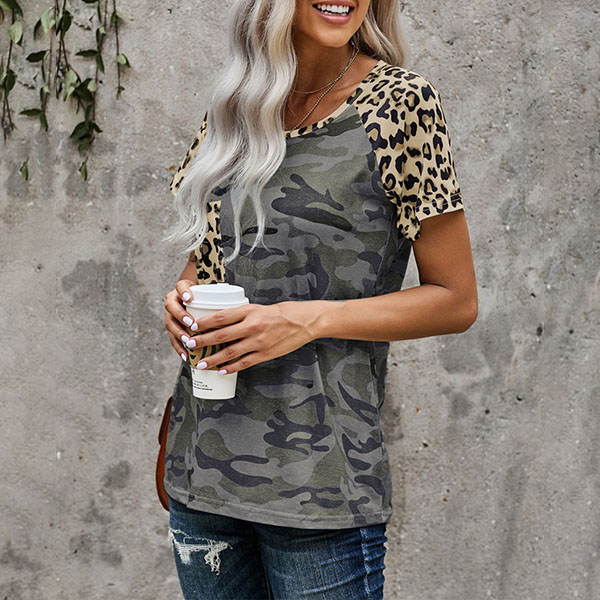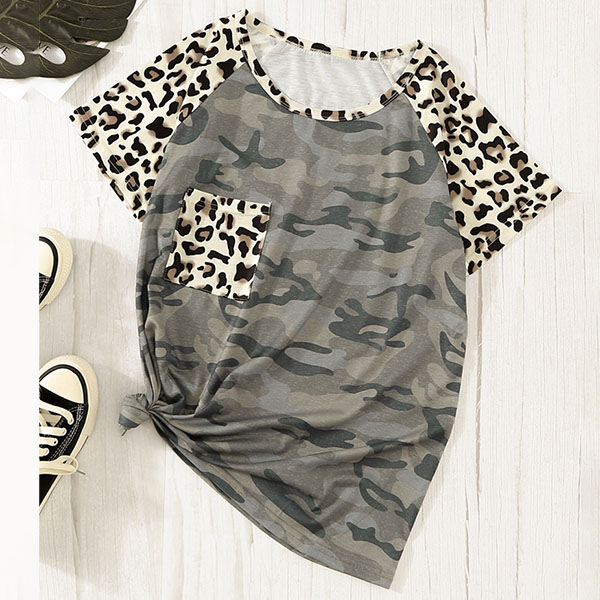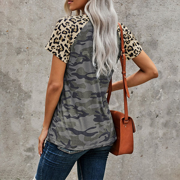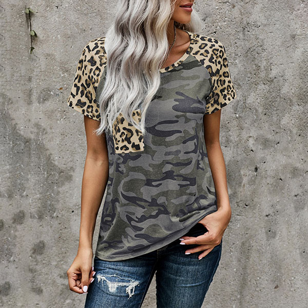 Fashion Leopard Spliced Short Sleeve Round Neck Camouflage Printed T-shirt