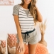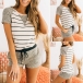 Fashion Leopard Spliced Short Sleeve Stripe T-shirt + Shorts Home-wear Set