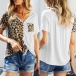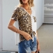 Fashion Leopard Spliced Short Sleeve V-neck Knotted Hem T-shirt