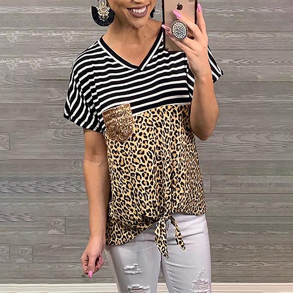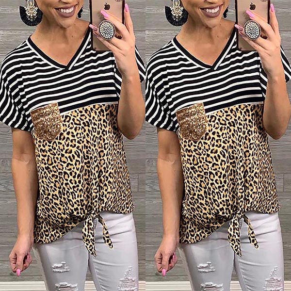 Combines of stripe and leopard element,this t-shirt can offer you an eye-catching look. Moreover,the knotted hem and v-neck design will further enhance its charm. You can trust in this piece to stay comfy while it exudes your style and charm.