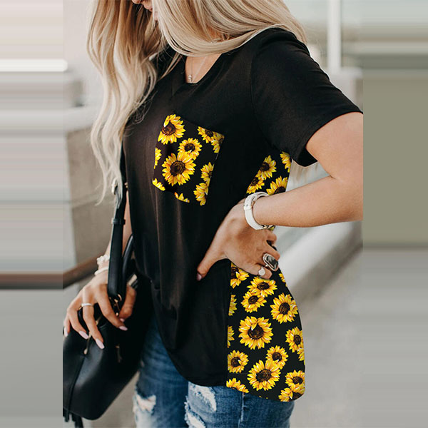As for a simple,casual and relaxed daily style,this t-shirt is a good solution. The leopard/sunflower printed details can easily enhance its entire charm. Crafted from soft and breathable fabric,with short sleeve,v-neck and chest patch pocket design,this t-shirt can offer you different matching styles.