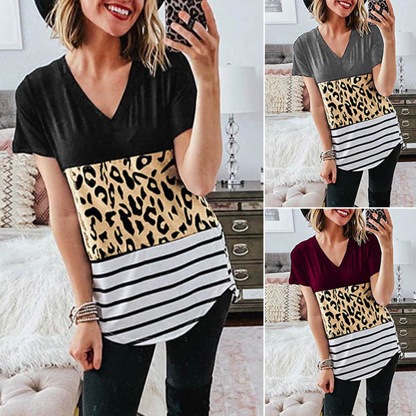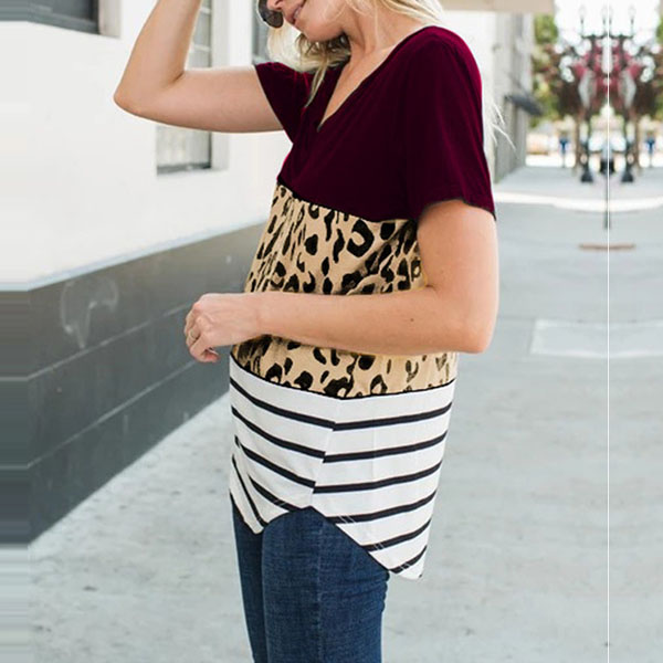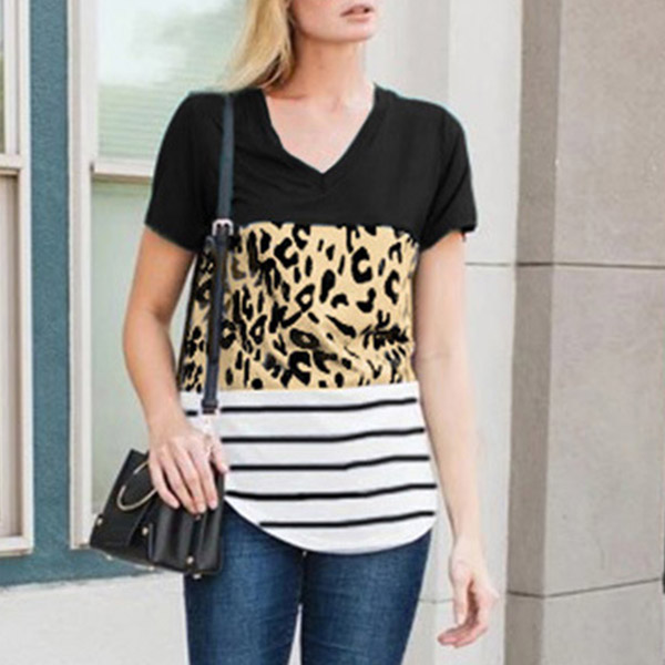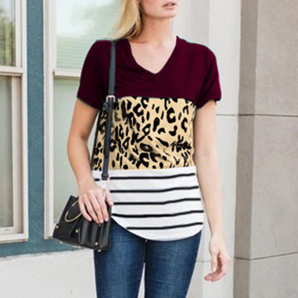 Fashion Leopard Spliced Short Sleeve V-neck T-shirt