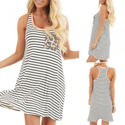 Fashion Leopard Spliced Sleeveless Round Neck Striped Dress