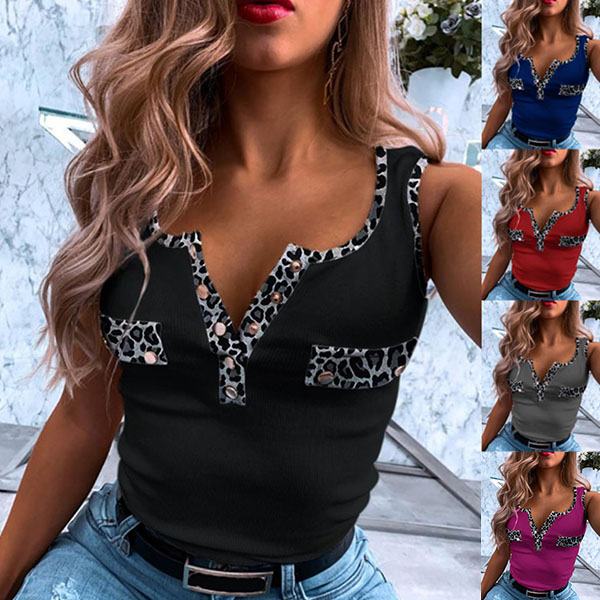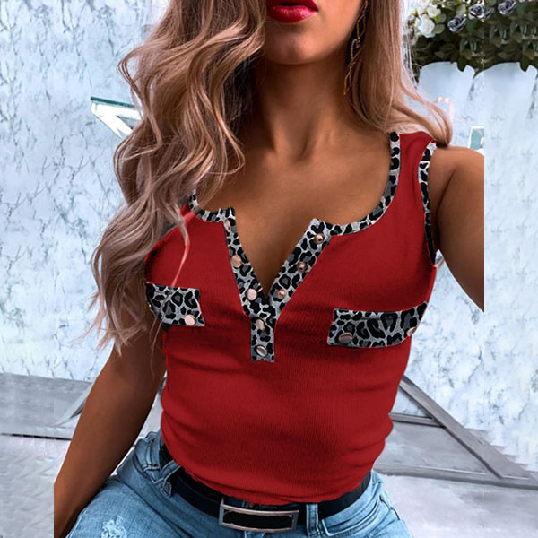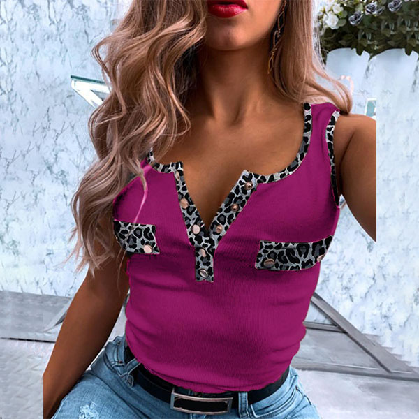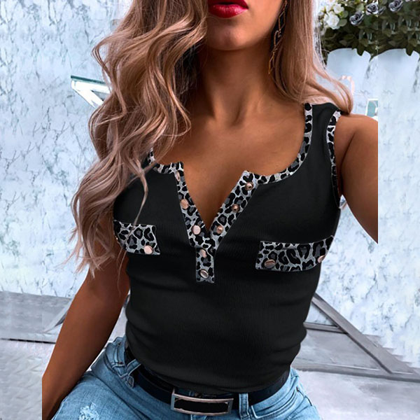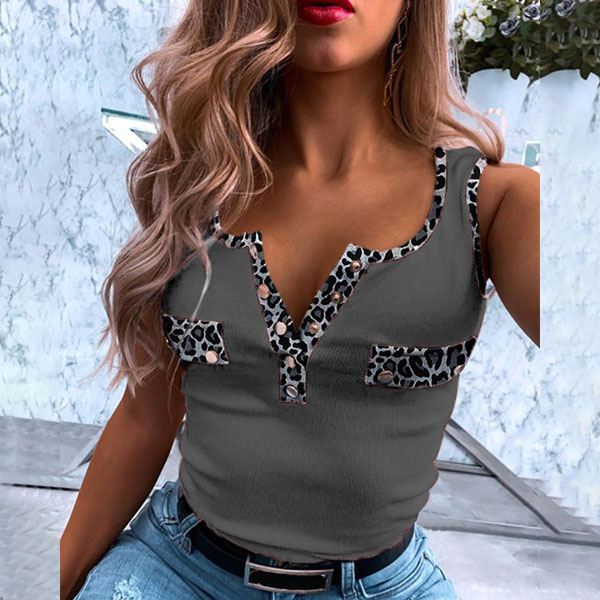 Fashion Leopard Spliced Sleeveless V-neck Slim Fit Tank Top