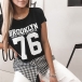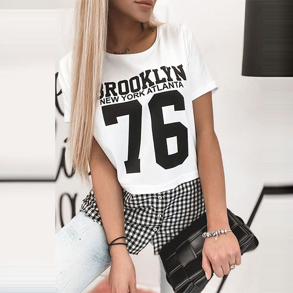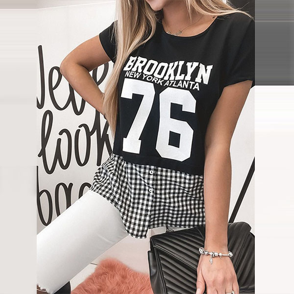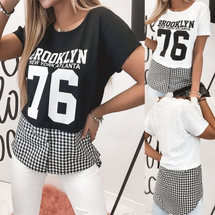 Fashion Letters Printed Short Sleeve Plaid Spliced Hem T-shirt