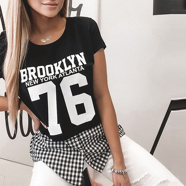 If you don't like too simple t-shirt,then this piece can easily strike your mind. The letters printed details and plaid spliced hem design make this piece look so distinctive and attractive. Wanna update your daily style? Then slip into this piece!