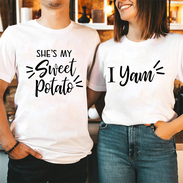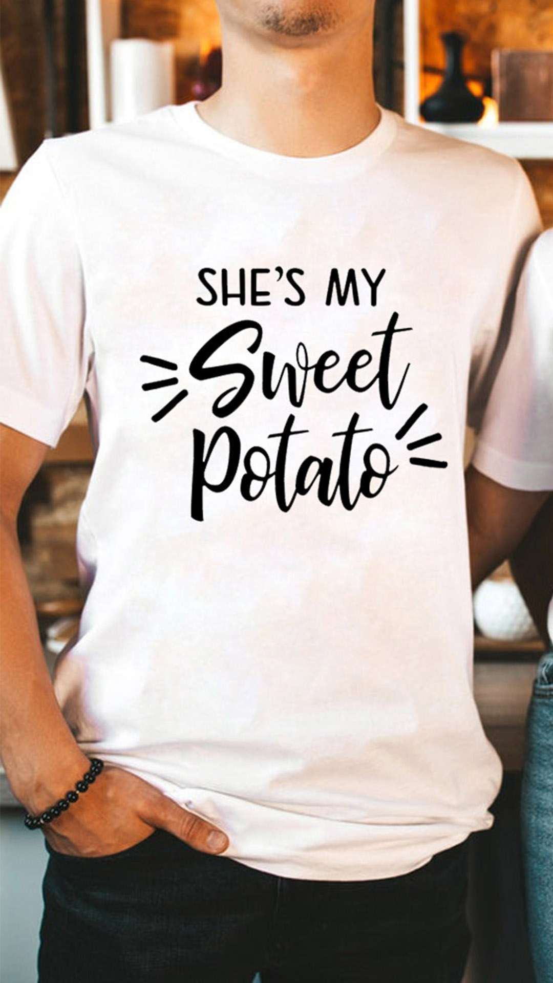 When you have a dating with your lover,you can choose this couple t-shirt to showcase your sweet and romantic love. The unique letters printed details like "SHE'S MY SWEET POTATO" make it look so playful and lively. Crafted from soft and breathable fabric,with short sleeve and round neck design,this couple t-shirt can increase your emotion.