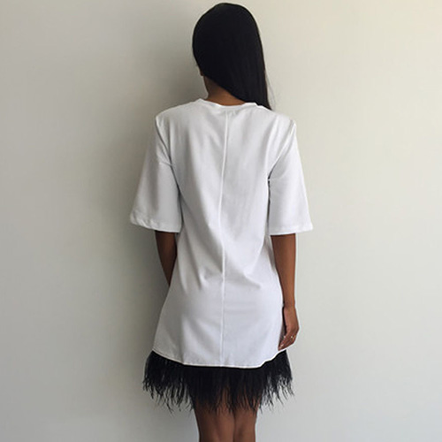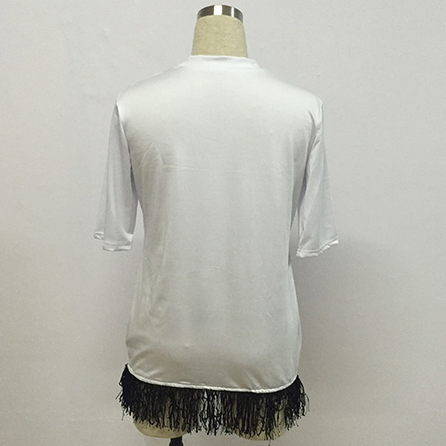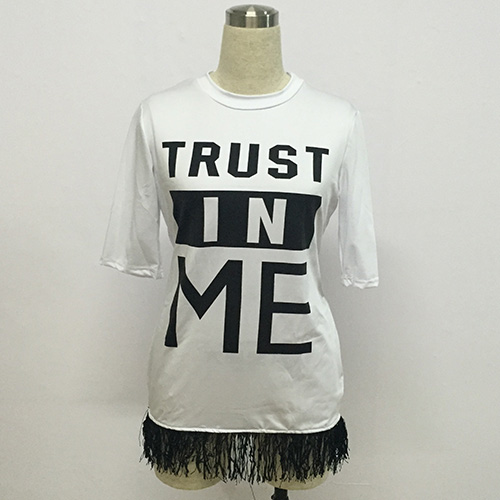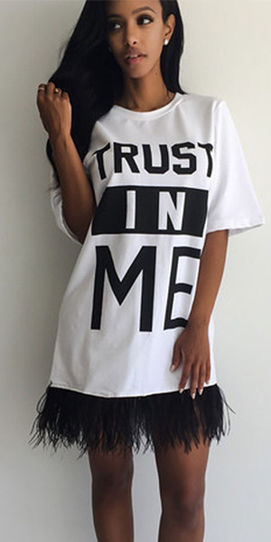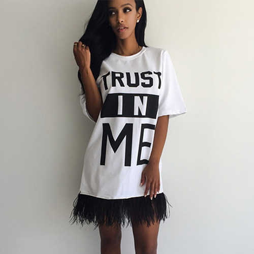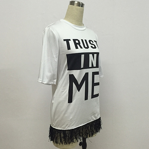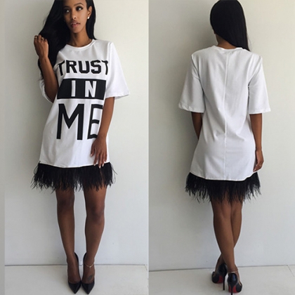 This short sleeve dress features letters printed style,with a round neck and tassel hem,looks