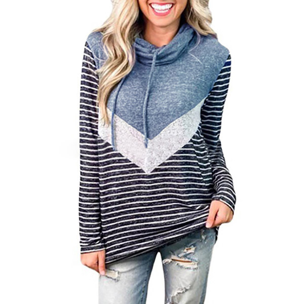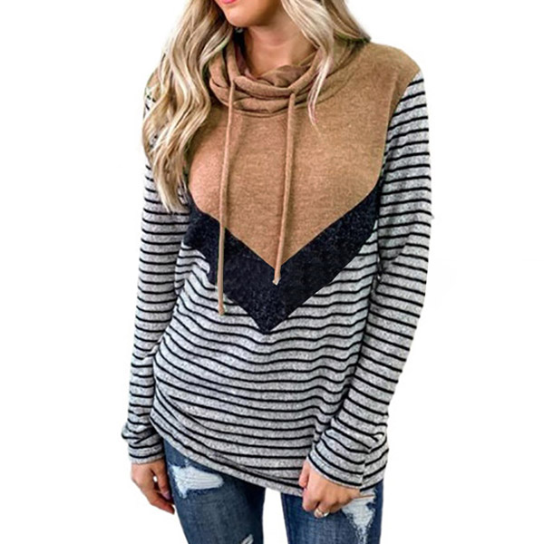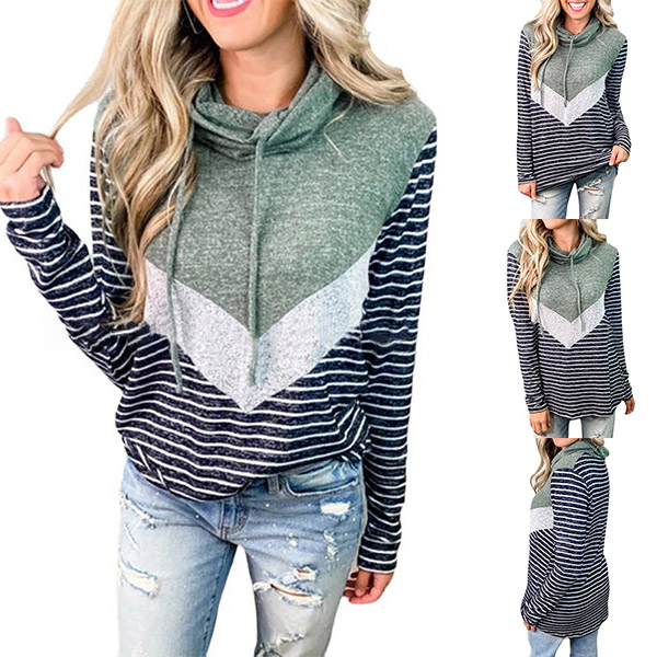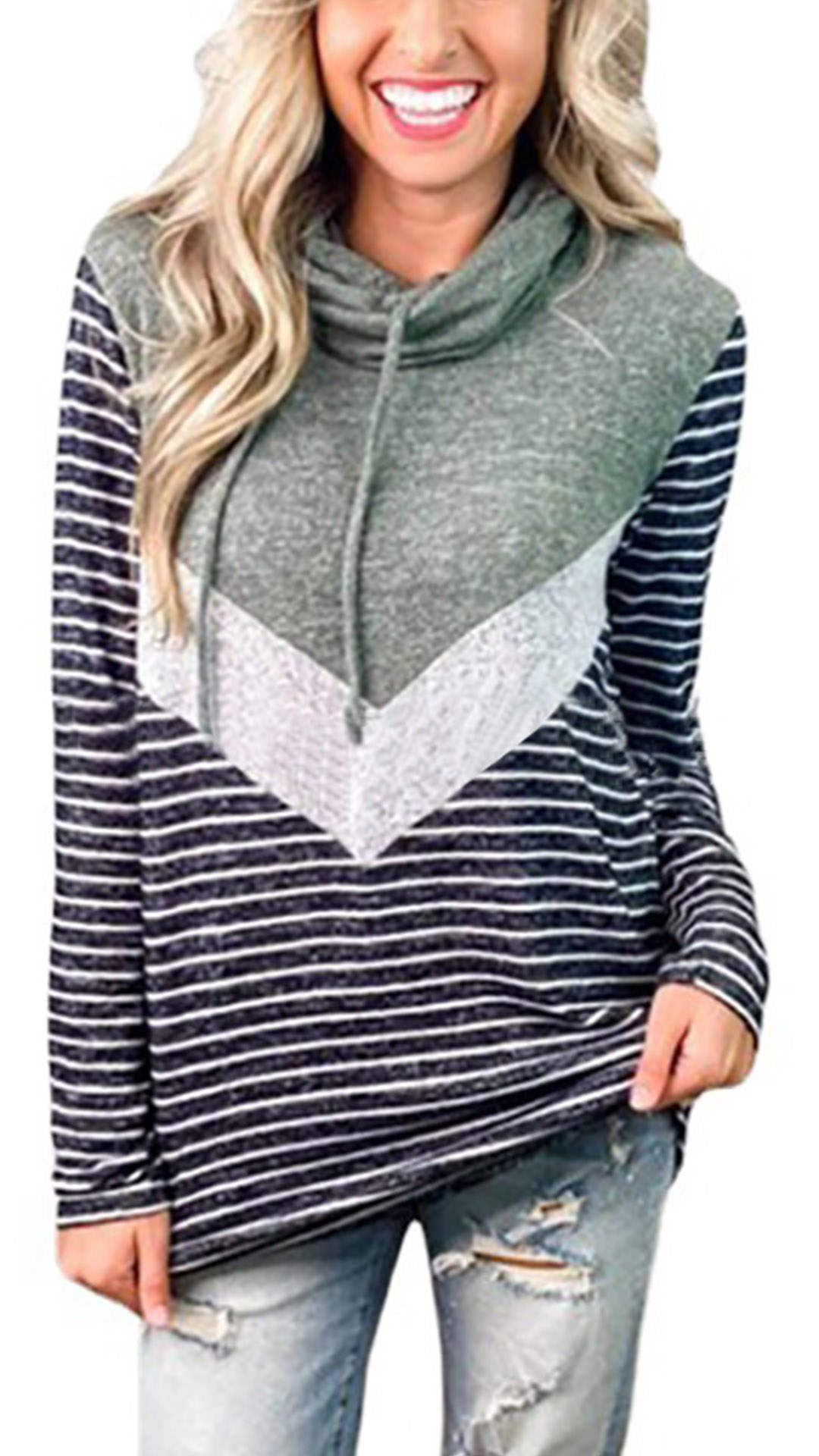When the summer season hits,this sweatshirt would be your perfect choice. The contrast color element and stripe design make this piece look so stylish and attractive. And the cowl neck with drawstring design will further enhance its charm. You can just match with a jeans to start your wonderful day.