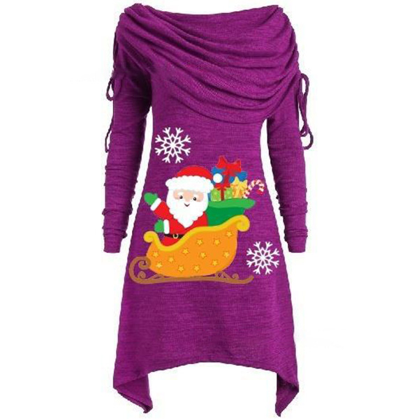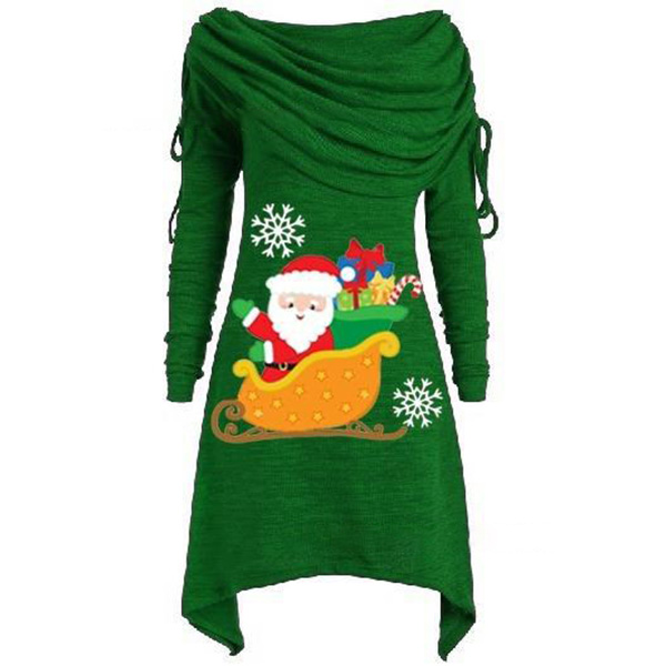 Greet the arrival of the Christmas Day with this dress. The Santa Claus and snowflake printed pattern design make this piece look so chic and playful,while the cowl neck and irregular hem design will make this piece look more attractive and distinctive. You can just slip into this dress to have a happy and wonderful Christmas time.