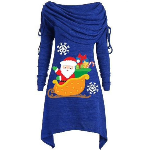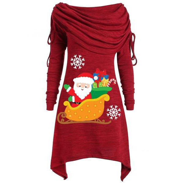Fashion Long Sleeve Cowl Neck Irregular Hem Santa Claus Printed Dress
