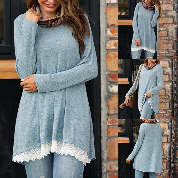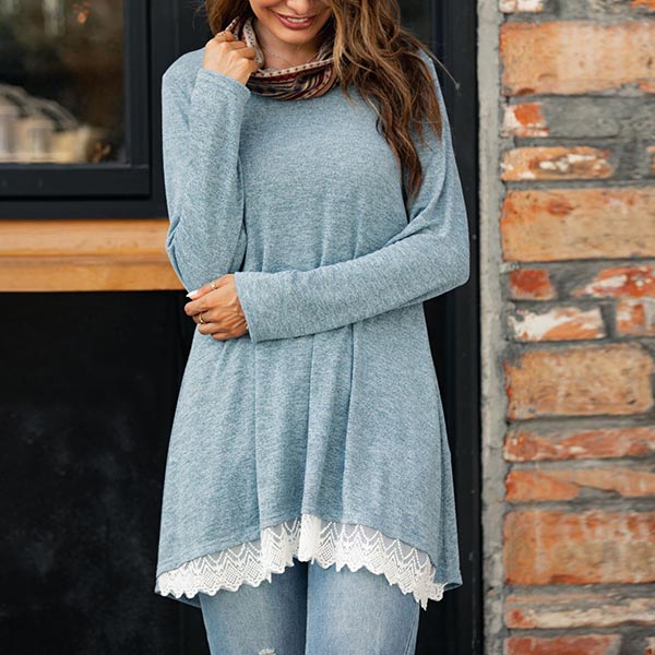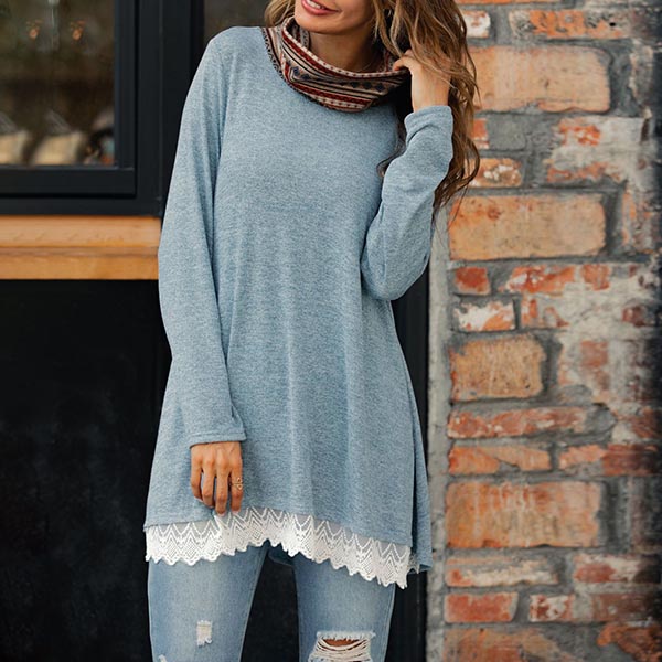 Fashion Long Sleeve Cowl Neck Lace Spliced Hem T-shirt