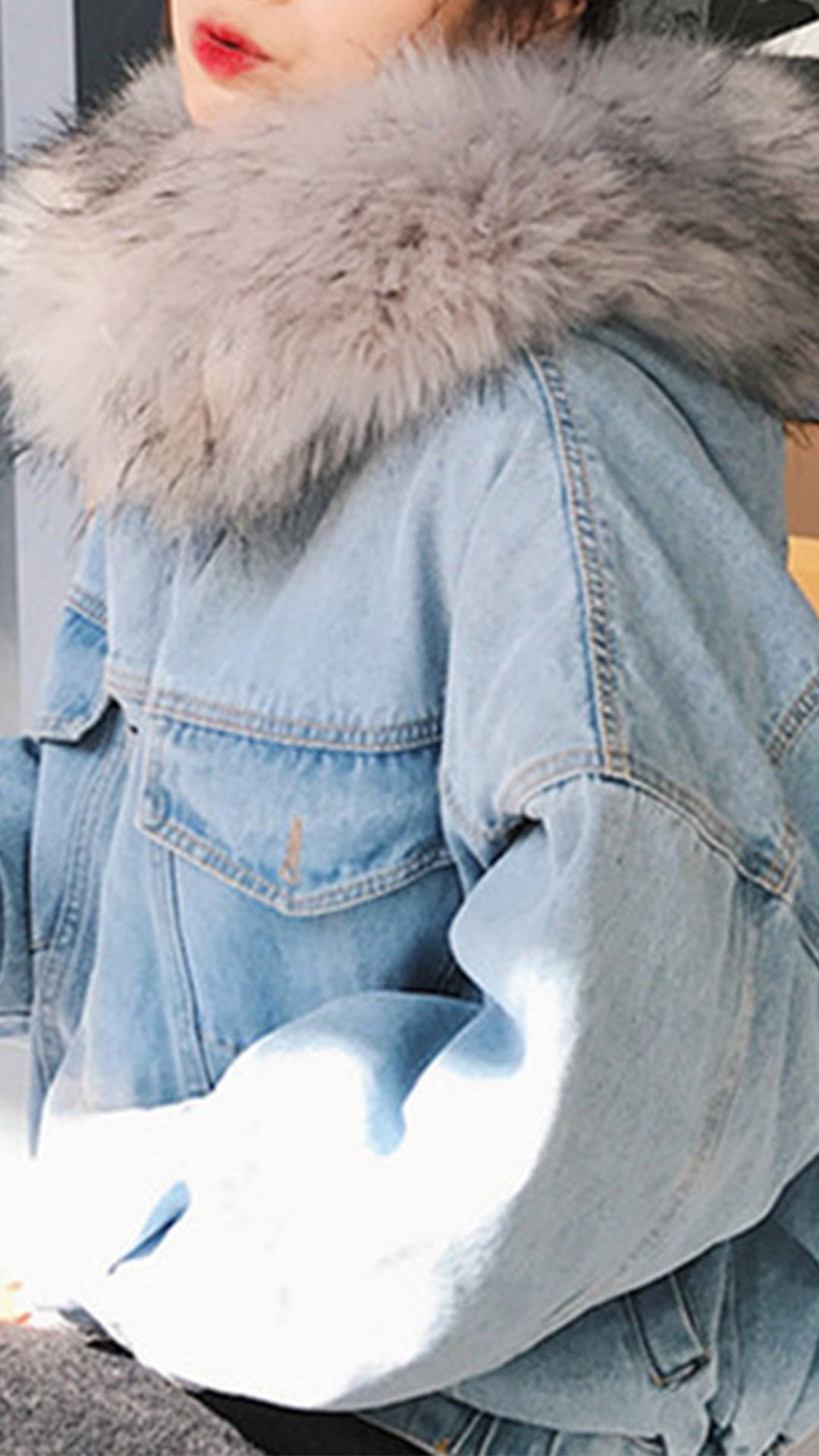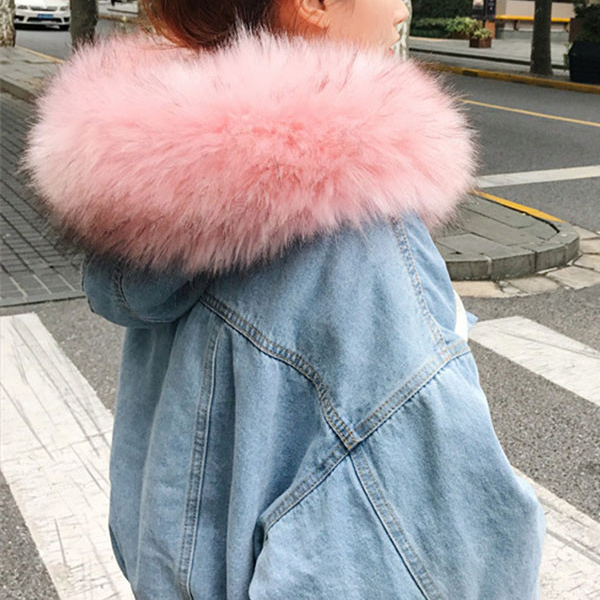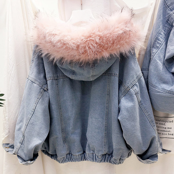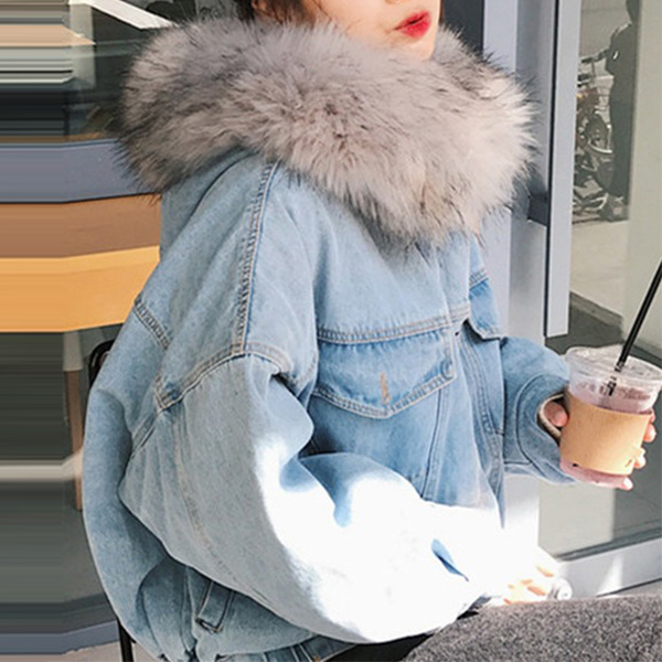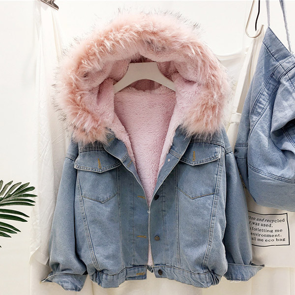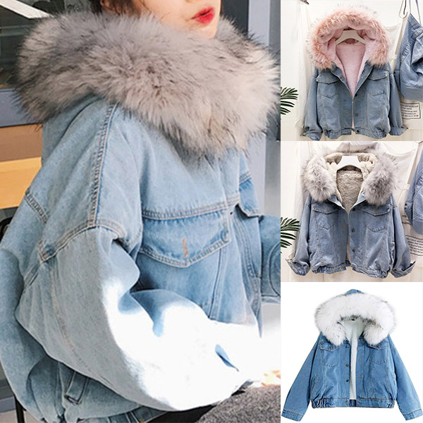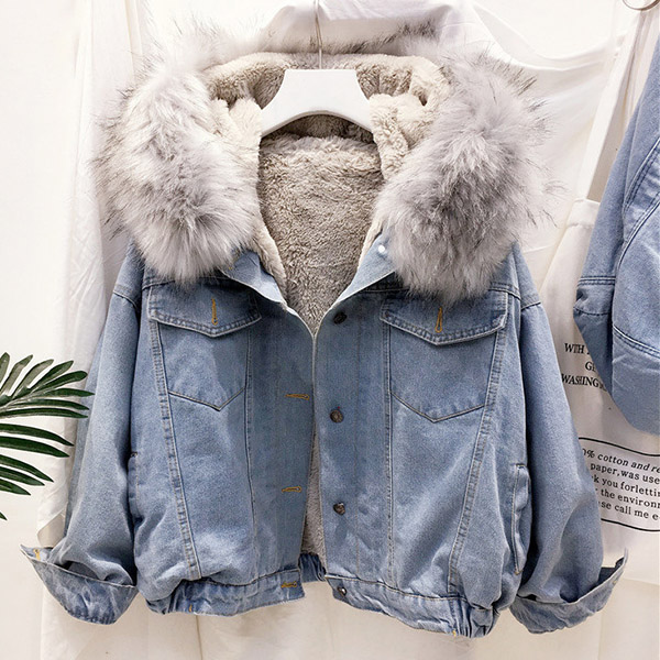 Fashion Long Sleeve Faux Fur Collar Plush Lining Denim Coat