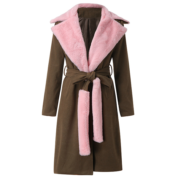 Fashion Long Sleeve Faux Fur Collar Woolen Coat with Waist Strap