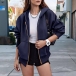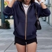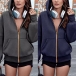 This sweatshirt jacket features long sleeves, front kangaroo pockets, and a front zipper closure, creating a stylish and practical piece. The hood adds a casual and sporty touch to the jacket, while the front zipper closure offers easy wear and a customizable fit. Pair it with leggings or jeans for a comfortable and on-trend outfit.