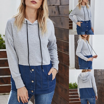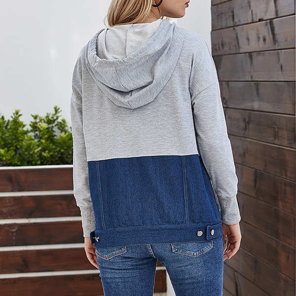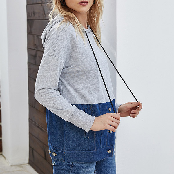 This sweatshirt that combines of chic and stylish vibes is worth to arouse your attention. It is finished with long sleeve and hooded silhouette,the denim spliced hem design will make this piece look more stylish and attractive. It is your perfect choice in these autumn days.