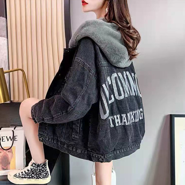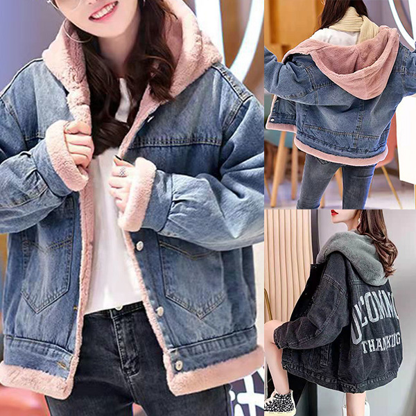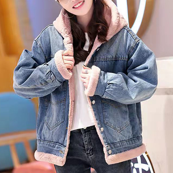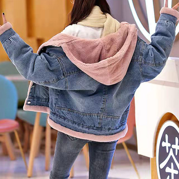 Fashion Long Sleeve Hooded Faux Cashmere Lining Denim Coat