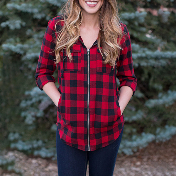 The plaid piece has been a prevailing style for many occasions. So may we suggest this piece that is worth as a staple in your wardrobe? It is designed with long sleeve,hooded silhouette,front-zipper closure and chest pockets,this wonderful top is perfect fit for the coming autumn days and spring days.