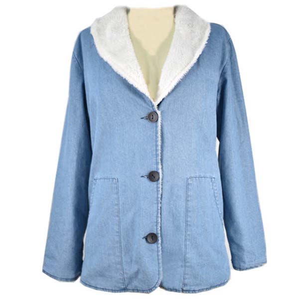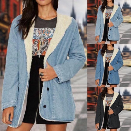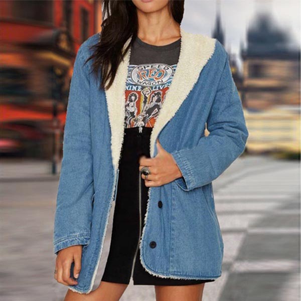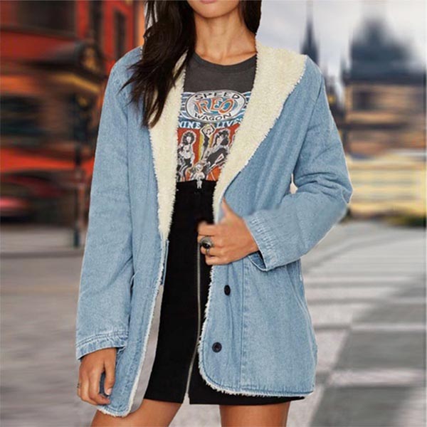 Fashion Long Sleeve Lapel Faux Cashmere Lining Denim Coat