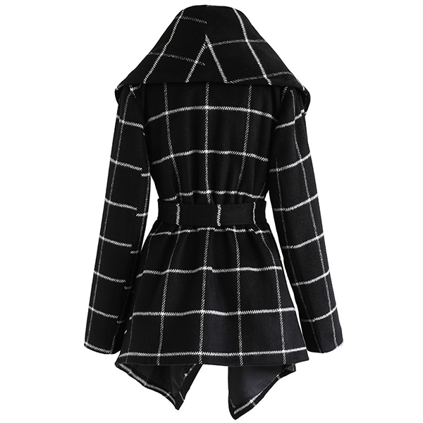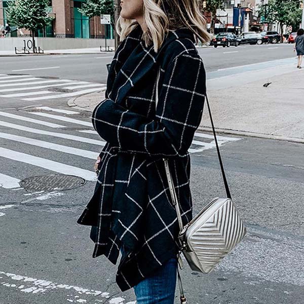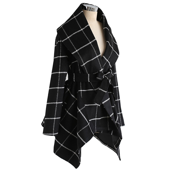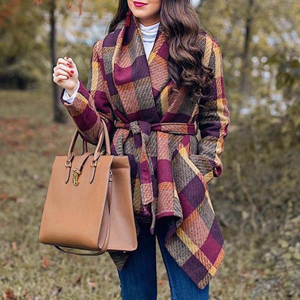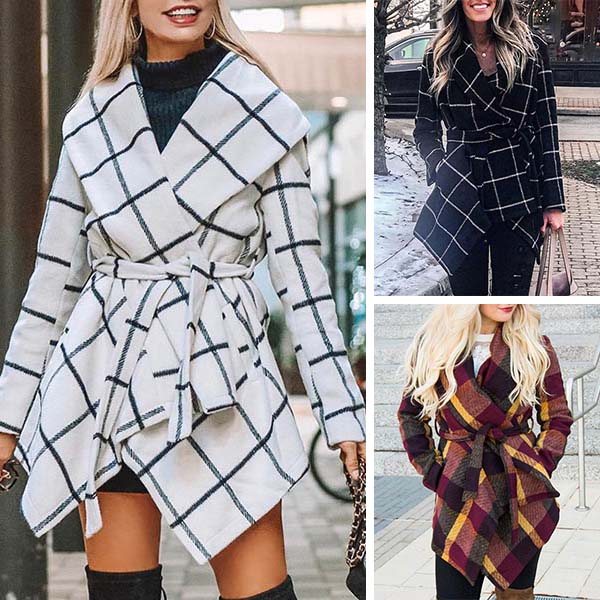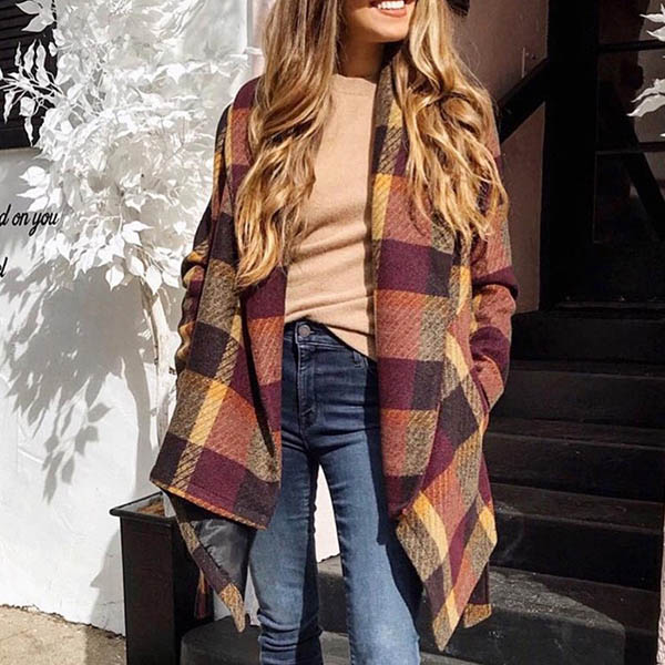 When the cold days hit,this stylish cardigan is worth to be your new darling. Plaid element design makes it look so stylish and popular,while the unique lapel and irregular hem design will further enhance its charm. When you feel cold,it is wise for you to slip into this piece to stay warm while maintaining your style.
