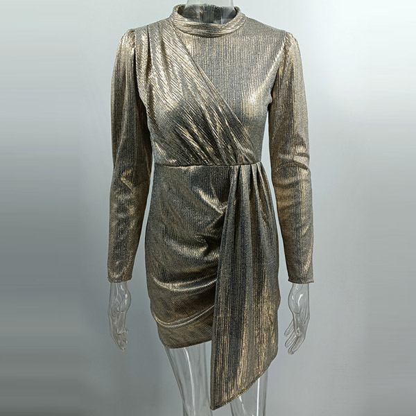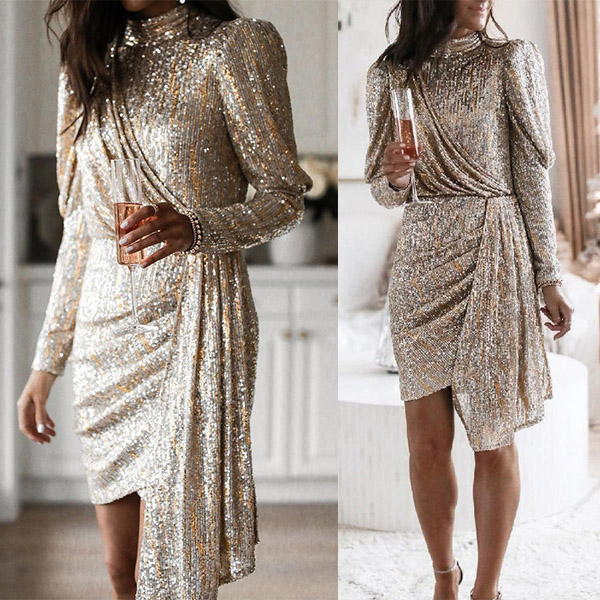 Fashion Long Sleeve Mock Neck Irregular Hem Slim Fit Sequin Party Dress