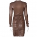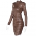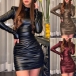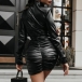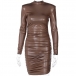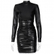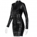 Fashion Long Sleeve Mock Neck Slim Fit Wrinkled PU Leather Dress
