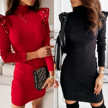 Fashion Long Sleeve Mock Neck Solid Color Beaded Slim Fit Dress