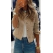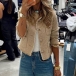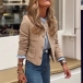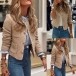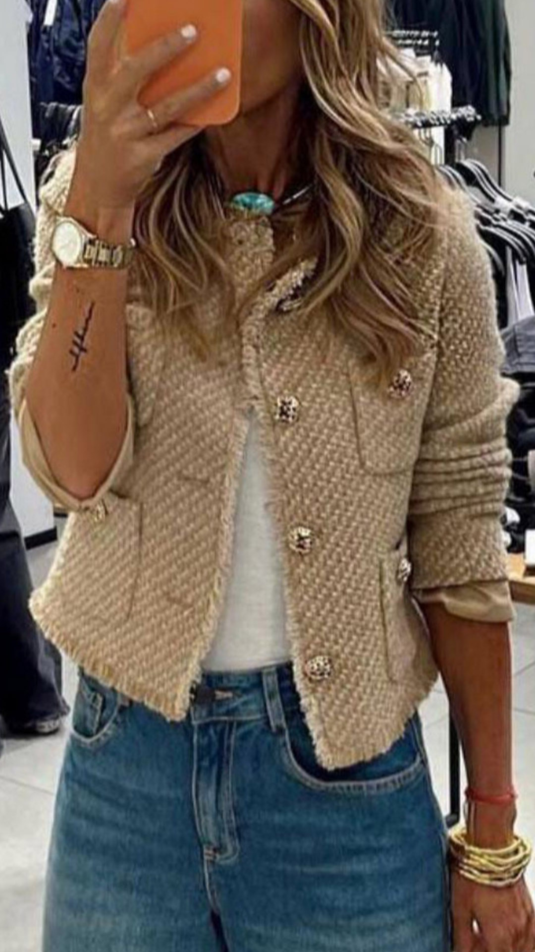 This fashionable jacket features long sleeves and multiple pockets, offering both style and functionality.