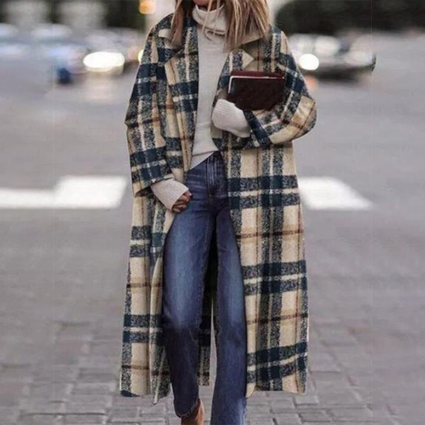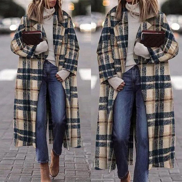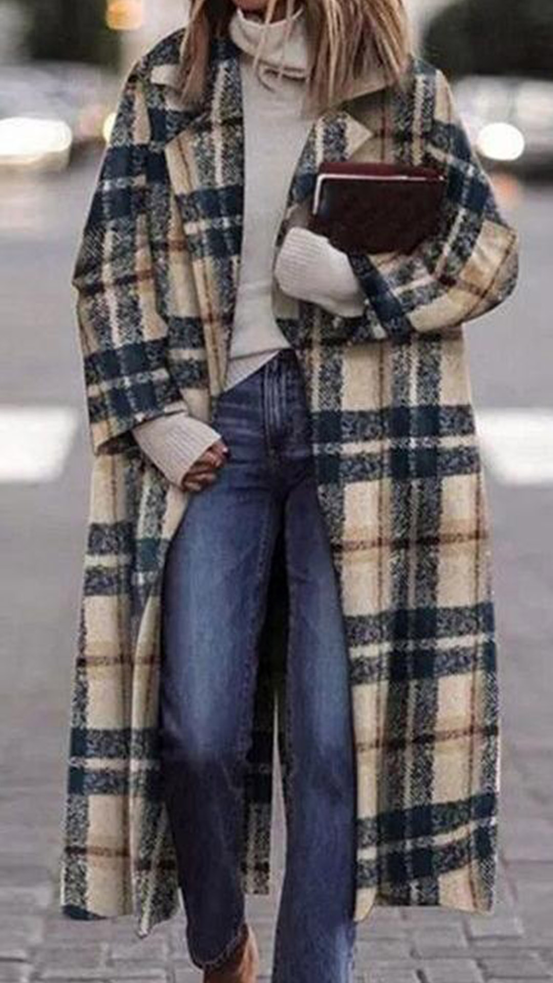 Fashion Long Sleeve Notched Lapel Loose Plaid Loose Duffle Coat
