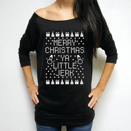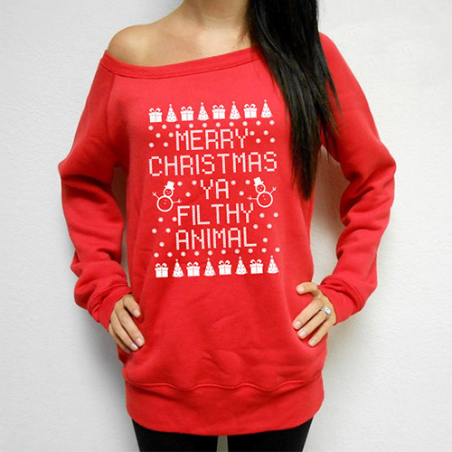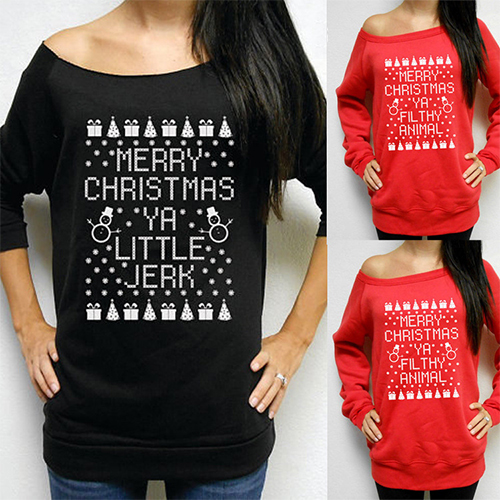 It features fashion style,with long sleeve, round neck, oblique shoulder and Christmas printed design,