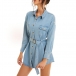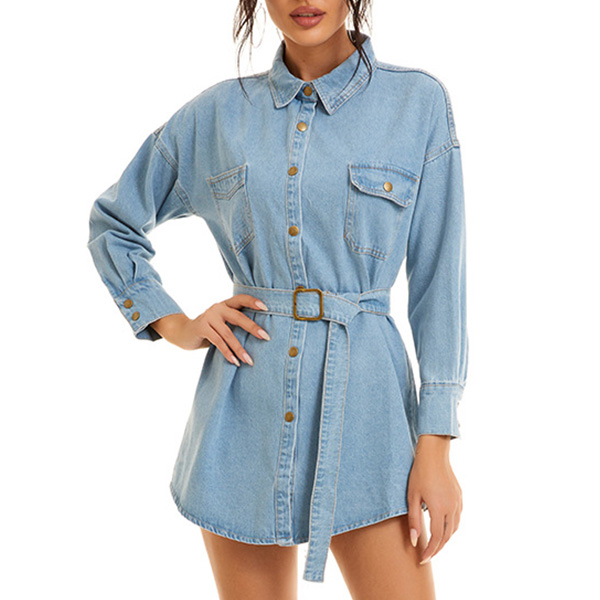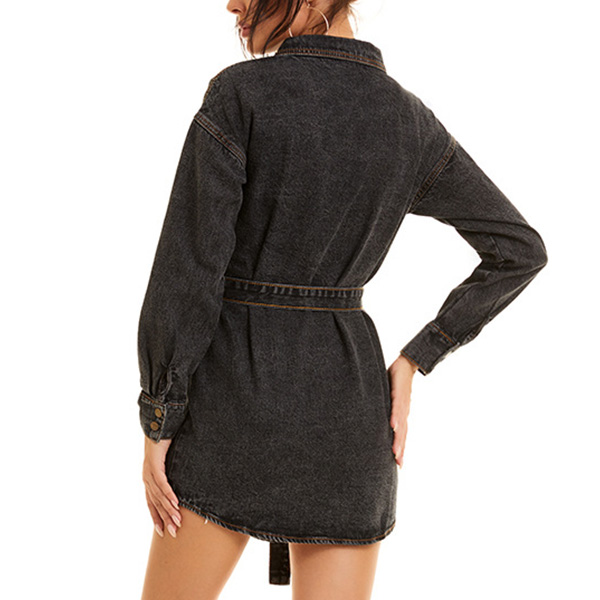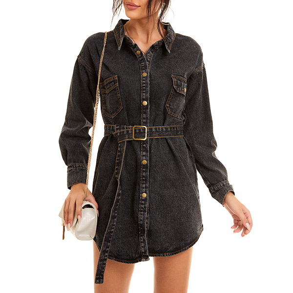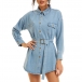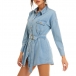 Fashion Long Sleeve POLO Collar Denim Dress with Waist Strap