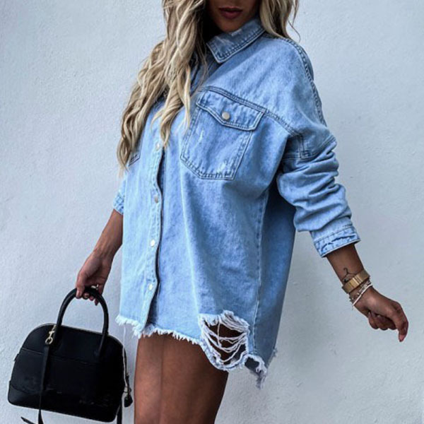 Give your wardrobe an update by adding this denim shirt. It is finished with long sleeve and POLO collar design,this shirt can give you a comfortable day with its soft and breathable fabric. Moreover,the ripped details will make this piece look more stylish and attractive. Like this style? Then don't miss it