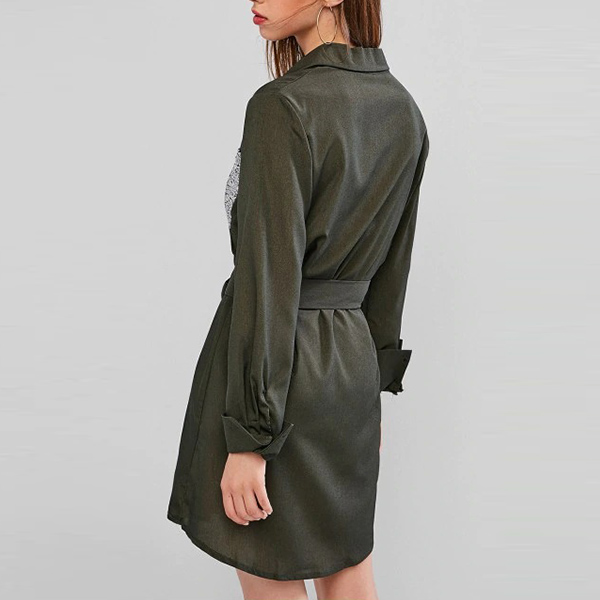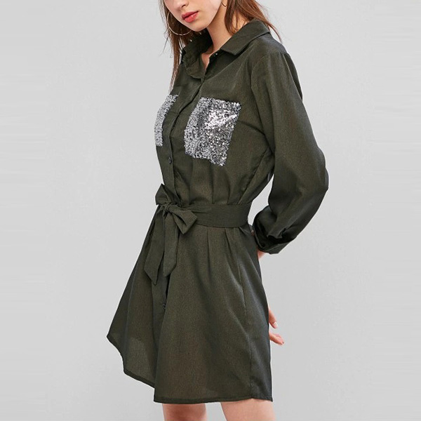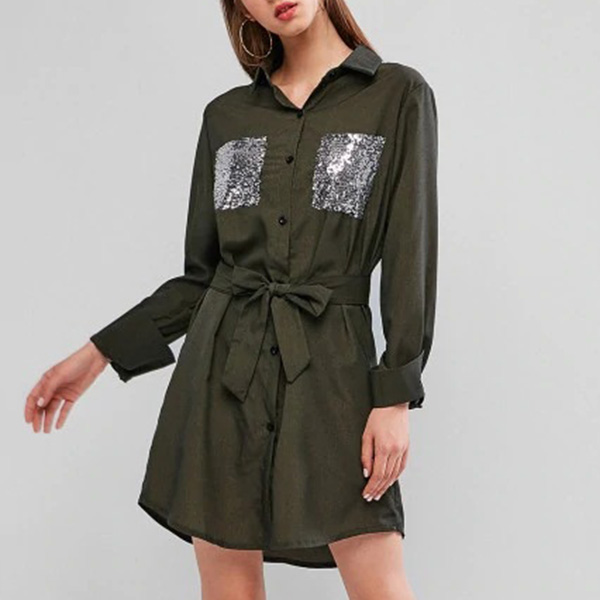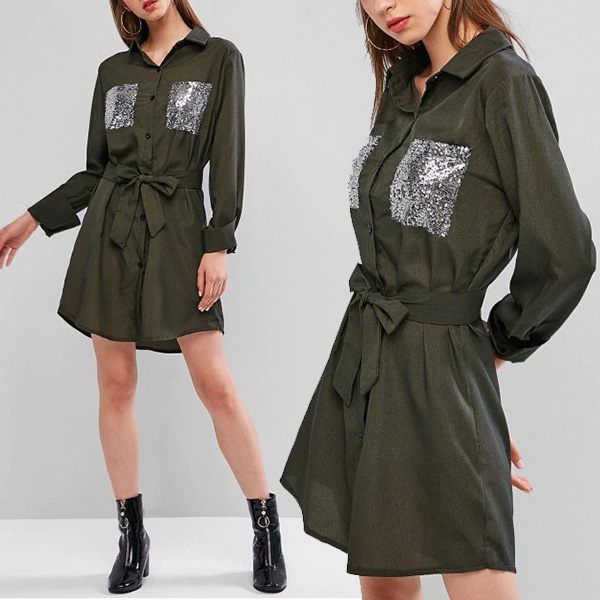 If there is one way to instantly give your style an instant boost,it is by introducing this shirt dress into your ensemble. It is finished with long sleeve,POLO collar and single-breasted design,classic yet stylish. The sequin spliced details and waist strap design will make this piece look more attractive. This is a dress which can fit for your workdays and weekends. So why not buy one?