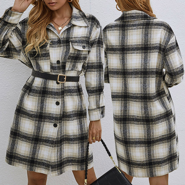 Fashion Long Sleeve POLO Collar Single-breasted Plaid Shirt Dress